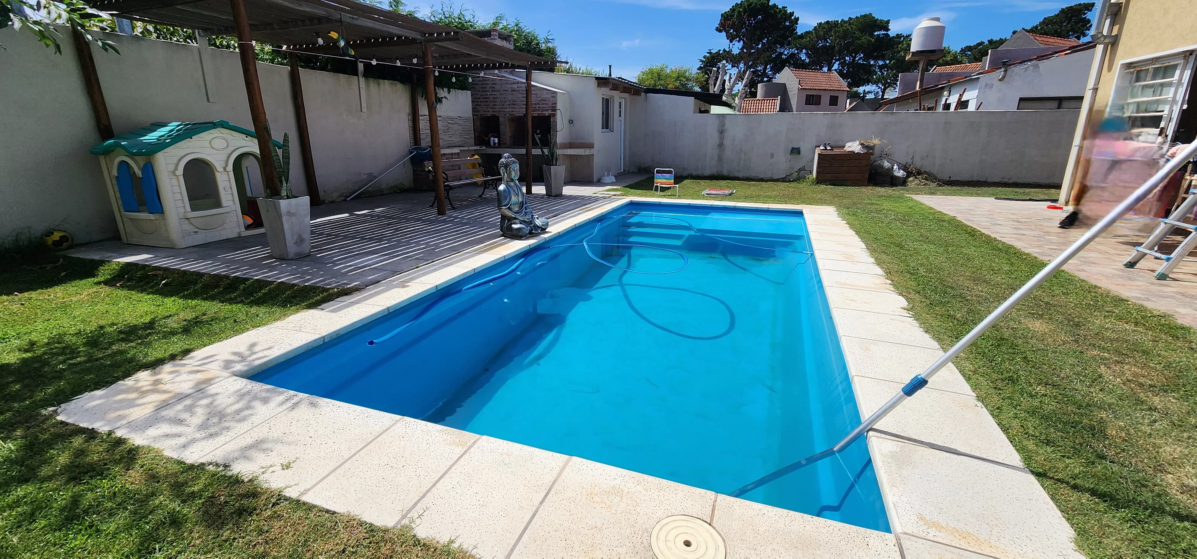 Comoda y amplia casa Piscina climatizada 4 dormitorios 2 baños. Lavadero Cocina comedor Living Quincho Estacionamiento para varios autos. Lote de 480m2 Casa de 110m2 Se acepta permuta o vehiculo en parte de pago. Haga su oferta de contado.