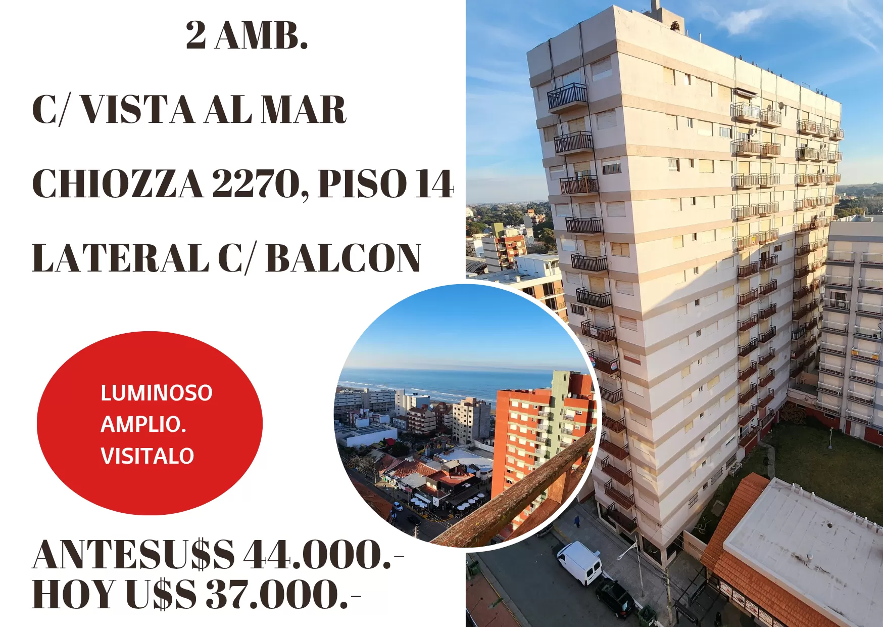 Lateral con balcon Vista al mar Cocina comedor Dormitorio con placard Baño completo
