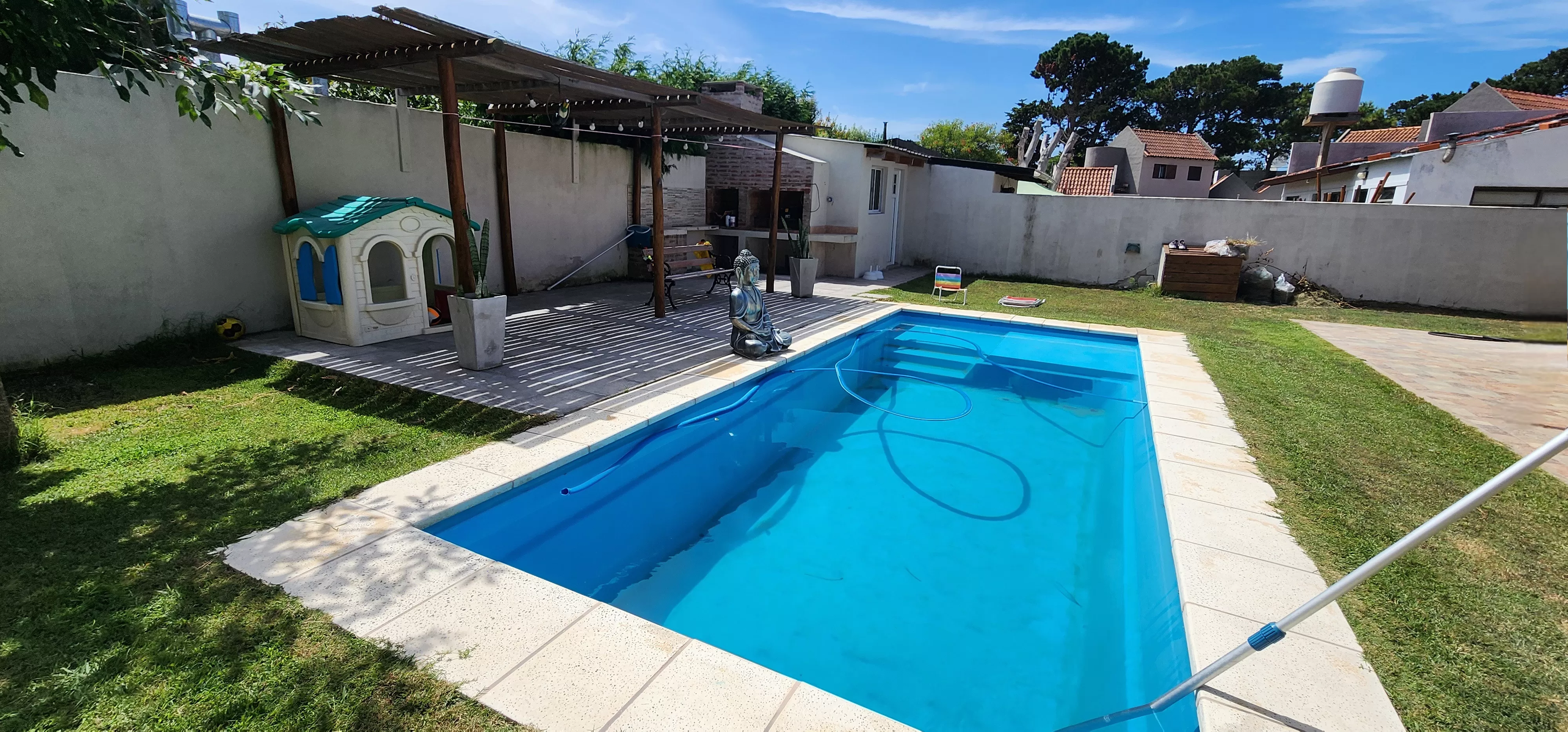 Comoda y amplia casa Piscina climatizada 4 dormitorios 2 baños. Lavadero Cocina comedor Living Quincho Estacionamiento para varios autos. Lote de 480m2 Casa de 110m2 Se acepta permuta o vehiculo en parte de pago. Haga su oferta de contado.